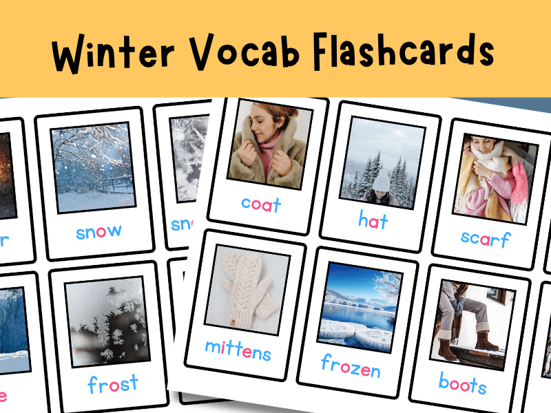 These printable EYFS winter vocabulary cards include 16 seasonal words: