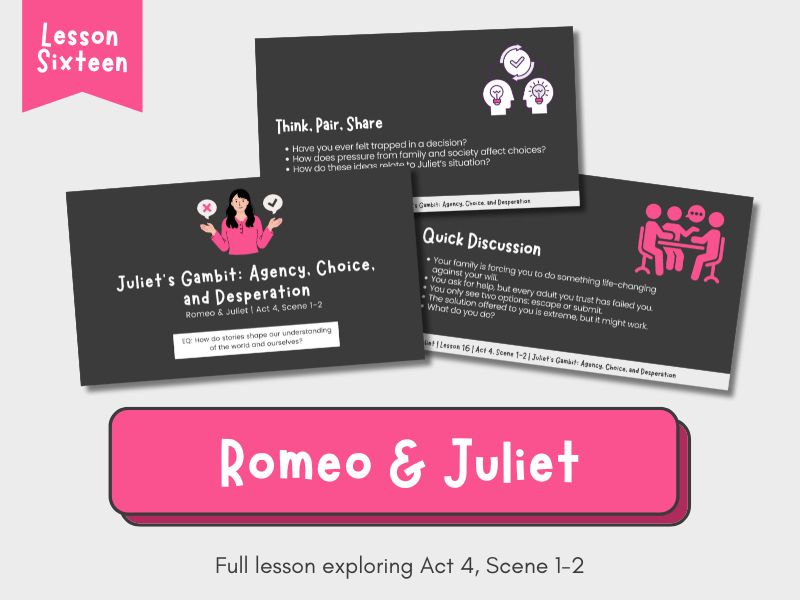 This lesson explores Act 4, Scenes 1-2 of Romeo and Juliet, focusing on Juliet’s plan to fake her death. Through discussion and textual analysis, students will examine the pressures that lead to her decision, the themes of agency and desperation, and whether her actions reflect strength or fear.