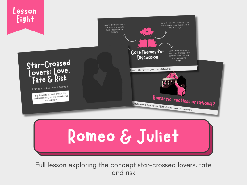 - Interactive Starter Task – Students evaluate actions from the play, deciding whether they are romantic, reckless, or rational, prompting discussion on love and impulsiveness.